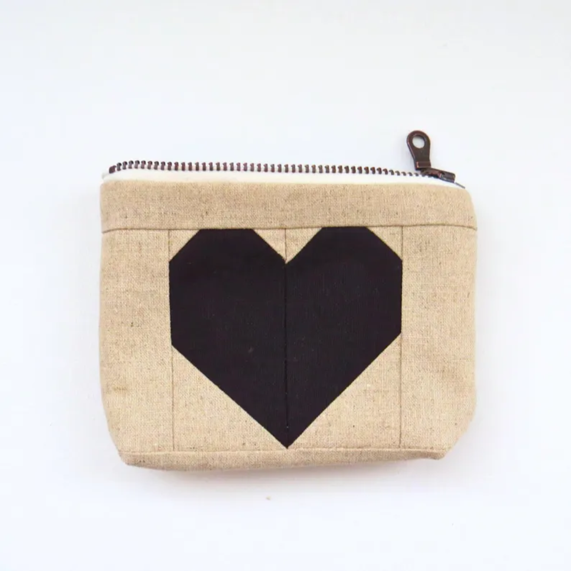 Bring a bit of handmade charm wherever you go with this quilted heart pouch. Each one is carefully pieced and quilted using a linen/cotton blend for a naturally textured, timeless look. Perfect for keeping small essentials tidy — from coins and sewing notions to earbuds or travel items.