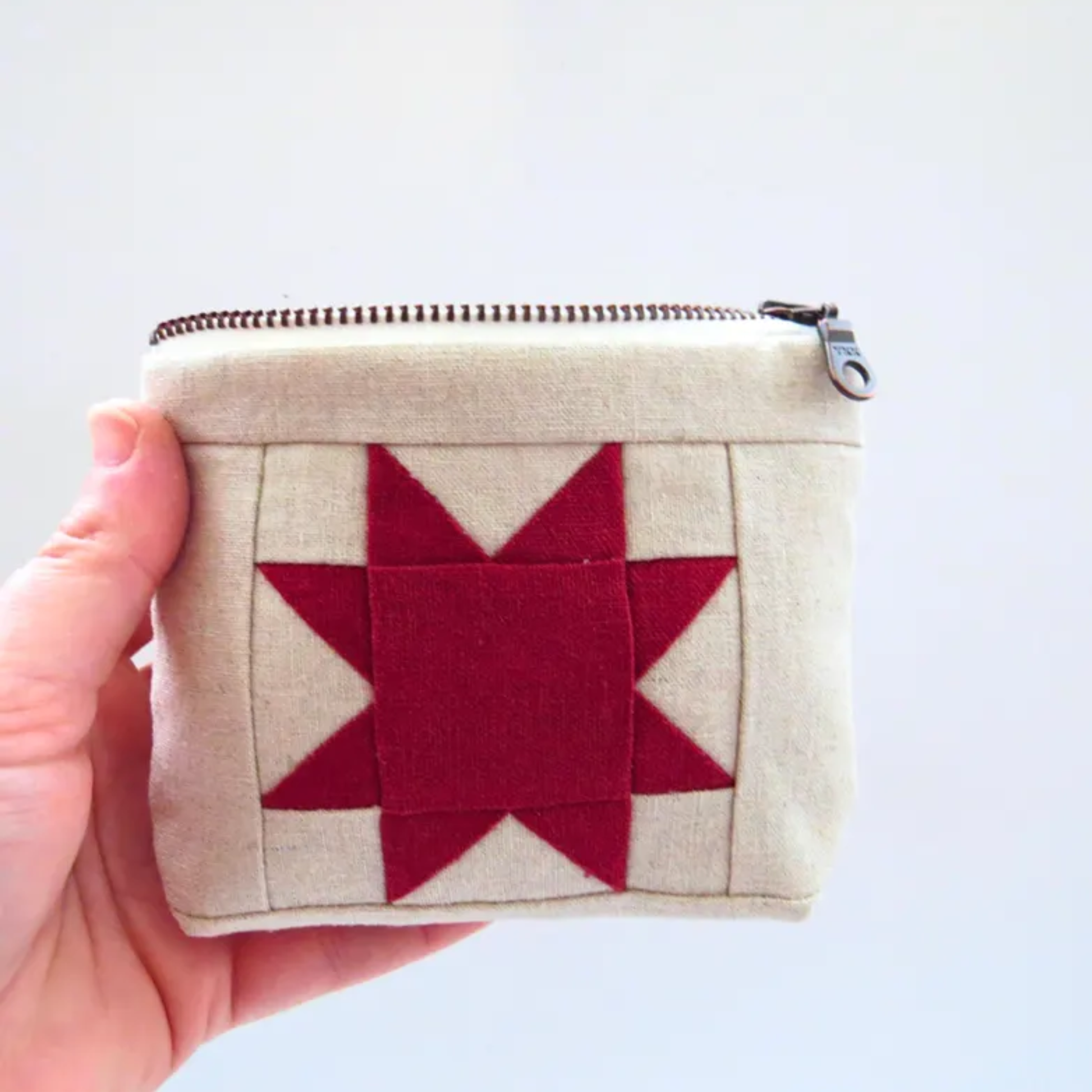 Bring a bit of handmade charm wherever you go with this quilted sawtooth star pouch. Each one is carefully pieced and quilted using a linen/cotton blend for a naturally textured, timeless look. Perfect for keeping small essentials tidy — from coins and sewing notions to earbuds or travel items.